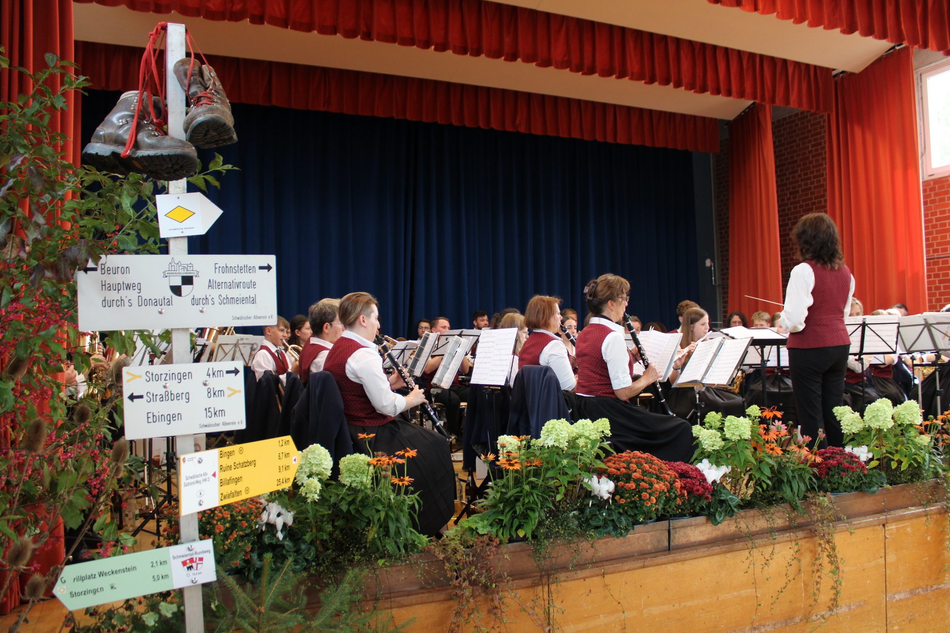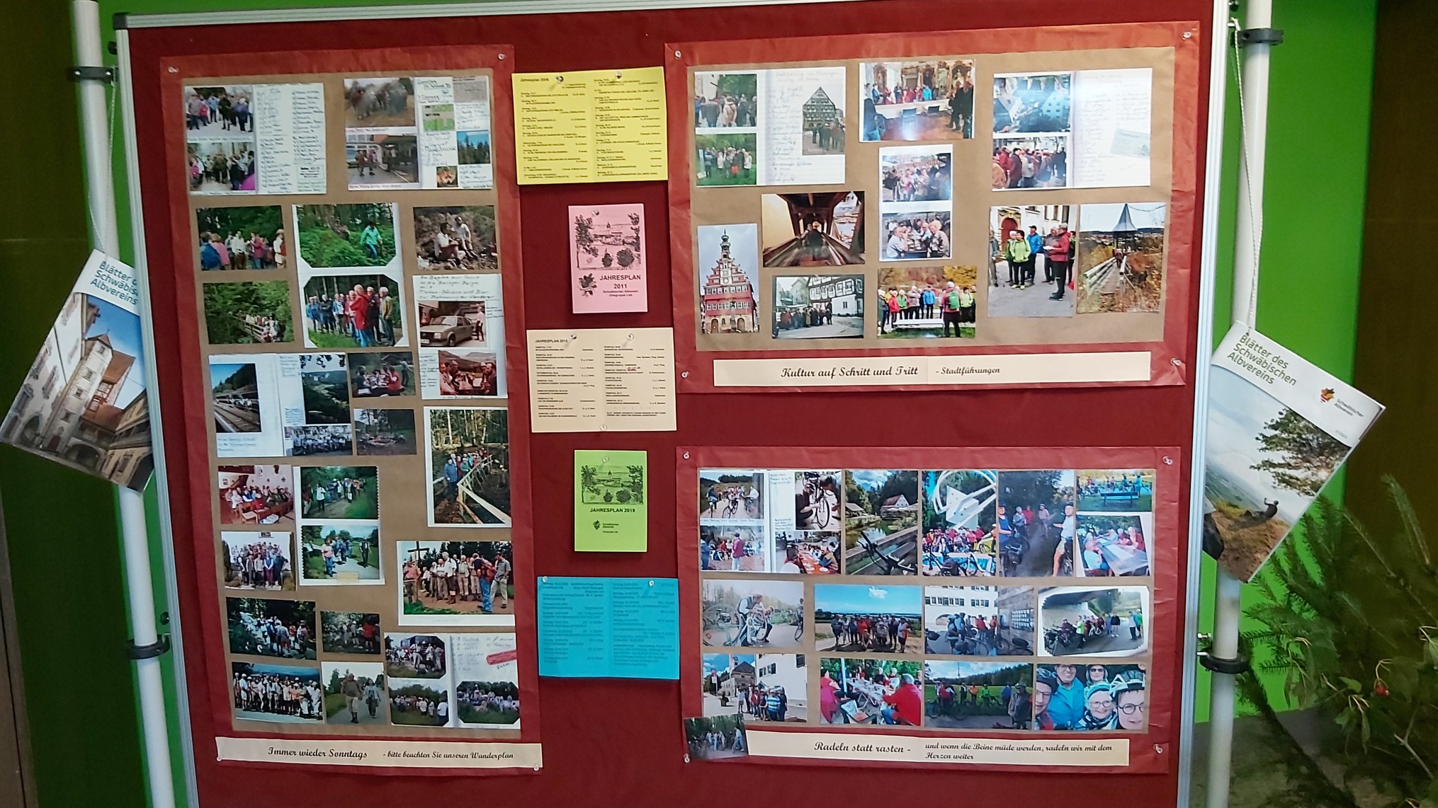 Im Foyer der herbstlich geschmückten Festhalle drehte sich alles um das 75-jährige Jubiläum des Laizer Albvereins. Thematisch sortierte Photos gaben herrliche Einblicke in 75 Jahre Albverein, ein Zeitplan wies auf 2 geführte Wanderungen am Vormittag, die Kunstausstellung Henselmann im Siechenhaus, den Frühschoppen mit der Musikkapelle Laiz sowie den Festakt um 14.00 hin.