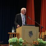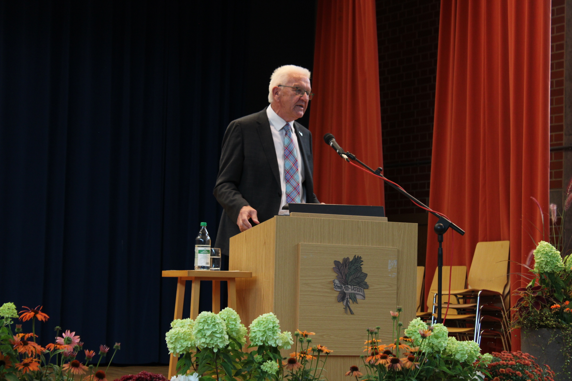 Höhepunkt des Festaktes war die Rede des Ministerpräsidenten und langjährigen Albvereinsmitglieds Winfried Kretschmann. Er stellte das Gehen in den Mittelpunkt, schlug den Bogen vom philosophischen Gehen bei Aristoteles, über die politischen Märsche bis hin zum heutigen Wandern, bei dem man seinen Standpunkt verlässt, Vielfalt genießt und aufmerksam für die Umgebung ist. Viel Zuspruch erhielt sein Beitrag zum schönen Laiz, das am Übergang von der engen oberen Donau zum weiten Donautal liegt und somit Perspektivwechsel bietet, wie man sie auch beim Wandern laufend hat. Mit der Feststellung „Ehrenamt macht nicht immer Spaß, aber immer Sinn“ beendete er seine Ansprache vor den über 200 Gästen.